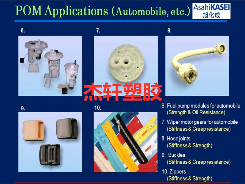 耐疲勞性、耐蠕變性、耐摩擦磨損性、工作溫度范圍大、耐有機(jī)化學(xué)品和堿長期尺寸穩(wěn)定性、比均聚甲醛更好的熱穩(wěn)定性和耐堿性